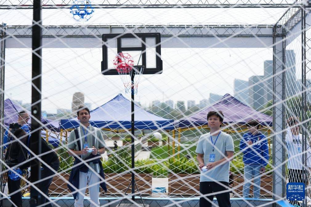 4月11日,参赛选手在无人机篮球比赛前试飞。