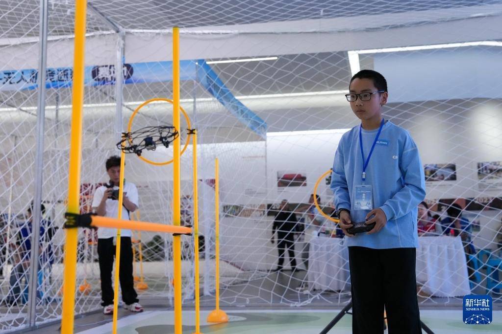 4月11日,一名学生在“未来飞手——无人机竞速赛”中操控无人机飞越障碍。