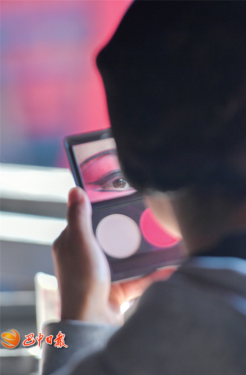 图六:川剧演员对着化妆盘细致描摹妆容。